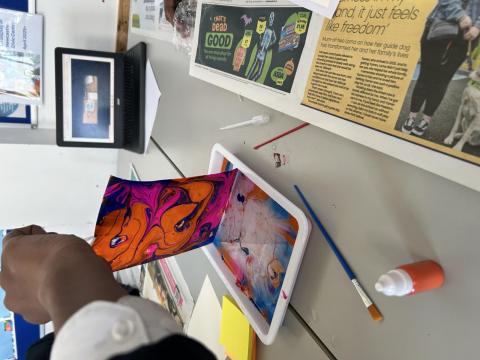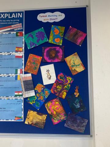 And here is a picture of the display board at Benfield Secondary with student artwork created at the ENACT Turkish Marbling Session in their EAL room!